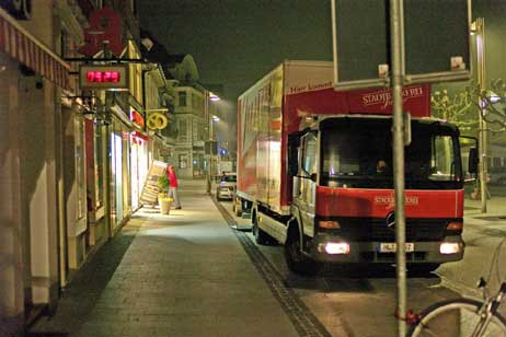 So geht es Reih um und schon steht er wieder dort vor der Tür, wo er angefangen hat. Her mit den leeren Stikken, denn auf die wartet in Lübeck schon die nächste Tour. Es sei jetzt die eher weiche Ware dran, meint Michael Berner, wenn er zum Ausdruck bringen will, daß nach Brötchen und Brot mit der zweiten Runde mehr Kuchen und süßen Sachen ausgeliert werden.
