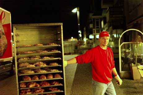 Michael Berner, der gute Geist bei Nacht und Morgengrauen, ist jetzt in seinem Element. Die praktischen Spezialwagen mit den Kuchenblechen, Stikken genannt, sind auf der Ladefläche seines Lasters fein säuberlich geordnet und nach Filialen sortiert. So reicht ein Griff und jede Filiale erhält, was sie am Tage vorher geordert hat.