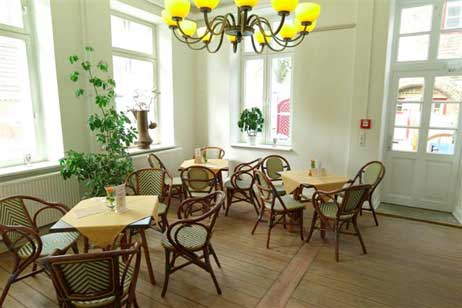 Rund 500 Gäste zieht es täglich in die Vogtei, am Wochenende schon mal tausend. Besonders wenn Musik ist, wenn Ann Junk ihre Cansons singt und wirkungsvoll die Renaissance-Treppe zur Bühne macht. Ordentlich Laufkundschaft für die ausgesuchten Geschäfte, von »Land und See« ganz vorn rechts über das Teekontor linker Hand, die Gastronomie bis hin zu Juwelier Strese, etwas ruhiger im Hofgebäude gelegen. Schmuck und Uhren will man ja in Ruhe gucken.