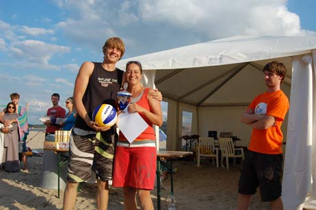 Am Strand herrschte eine super Stimmung, vor allem durch das anhaltend schöne Wetter. Auch der plötzlich einsetzende Regen am Sonntagabend hielt die Damen und Herren-Teams nicht von ihren Finalspielen ab. Die anderen Spieler flüchteten vor dem Regenschauer ins trockene Orga-Zelt. Mitten im lebendigen Gemenge im Orga-Zelt fand die Siegerehrung des Quattro-Mixed-Turniers statt.