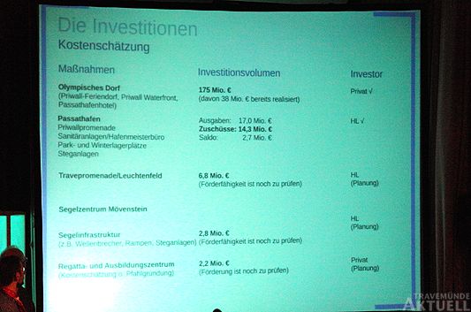 Ich bin für Segelolympia in Travemünde. Ob die Bewertungskommission am Freitag, oder auch die Weltpresse etwas damit anfangen können, dass der Bürgermeister den Möwenshietchor mit dem Passatchor verwechselt, uns einen Möwenstrand verpasst, den es gar nicht gibt und ein Schreihals auf der Bühne gröhlt, ob wir gut drauf seien und uns einen Crashsong ins Ohr bohrt, den niemand so richtig gut fand und gutgelaunt vor sich hinsummte, als er den großen Saal im Maritim verlies, sei dahingestellt. Der Bürgermeister hin- und hergerissen bei seinem Sprech von der Leinwand zum Publikum und verfangen in den Tücken der Präsentationstechnik und die Großkopfeten vom Ortsrat mit verdrehten Köpfen zu den Leinwänden schielend – ich fand das ganze kleinkariert, langatmig, provinziell. Locker und flockig – das wär’s gewesen. Bleibt das Versprechen des Bürgermeisters, dass der Grünstrand nicht bebaut wird – immerhin was Gutes an dem Abend. Dennoch – ich bin für Segelolympia in Travemünde.