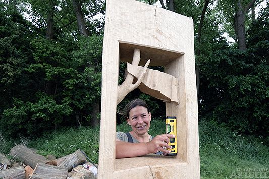 So war es dann vor einigen Wochen so weit, dass die dritte Duckdalbe in Angriff genommen werden konnte. Sabine Klupsch arbeitete stets im Freien am Kohlenhof. Viele Besucher interessierten sich für ihre Holzarbeiten und auch für die Motive. Mit vereinten Kräften und Mitgliedern des Vorstandes des Vereins für Kunst und Kultur e.V. ist nunmehr die letzte der drei Duckdalben auf einer Steinplatte aufgestellt und den anderen Stelen hinzugefügt worden. In dieser als letzte fertig gewordenen Stele, die ganz links steht, sieht man eine Fahne, die in das ins Holz gearbeitete Fenster ins Leere hineinweht. Sie soll, so Sabine Klupsch bei der Erläuterung ihrer Arbeiten, den Priwall in seiner isolierten Insellage zeigen, der getrennt ist auf der einen Seite durch die innerdeutsche Grenze zur DDR und von der anderen Seite durch die Trave und die anderen Gewässer.
