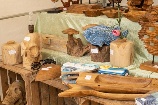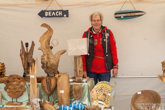 Es ging heute morgen ruhig los, da es noch etwas nieselte, ab 13:00 Uhr wurde dann ausgelassen geschlendert, gestöbert, an- und ausprobiert und entdeckt. Der Festplatz und die Promenade im Niendorfer Hafen haben sich in eine bunte Ausstellungsfläche verwandelt. Handgestricktes, variantenreicher Schmuck, schöne Taschen und Körbe, Gewürze, Gin und edle Obstbrände, Bilder, Marmeladen, Schmuckstücke aus Glas- und Holz und viele weitere exklusive selbstproduzierte Produkte findet man hier. Die Künstler, Handwerker und Designer sind selbst anwesend und geben gern über ihre angepriesenen Waren, die verwendeten Materialien und über die Herstellung Auskunft.