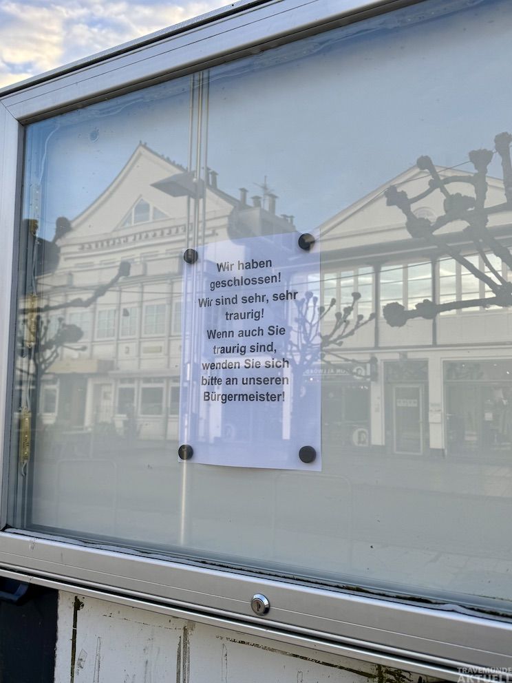 Aktuell weist ein Aushang vor dem geschlossenen Restaurant auf die Situation hin. Darauf ist zu lesen: »Wir haben geschlossen! Wir sind sehr, sehr traurig! Wenn auch Sie traurig sind, wenden Sie sich an unseren Bürgermeister!« Die persönliche Botschaft macht deutlich, wie emotional der Abschied nach fast 25 Jahren Gastronomie an der Vorderreihe ist.