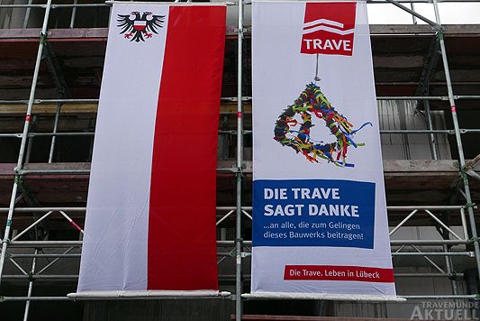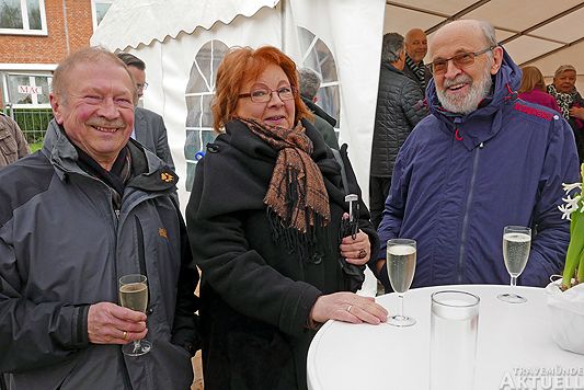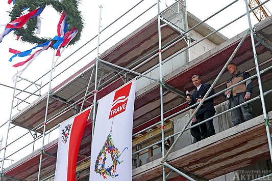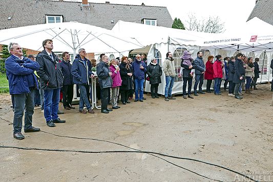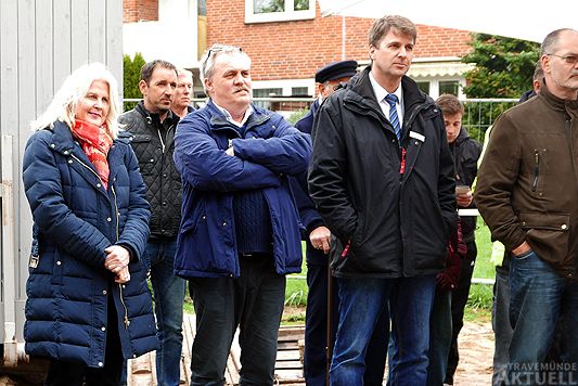 Trotz der nahenden Osterfeiertage konnte Geschäftsführer Dr. Matthias Rasch zahlreiche Gäste auf der Baustelle im Steenkamp 34-44 begrüßten. Darunter ausdrücklich auch Vertreter des Travemünder Ortsrates sowie Kultursenatorin Kathrin Weiher, »die in diesem Jahr bekanntlich als Bürgermeisterin kandidieren wird«, so Rasch in seiner Ansprache.
